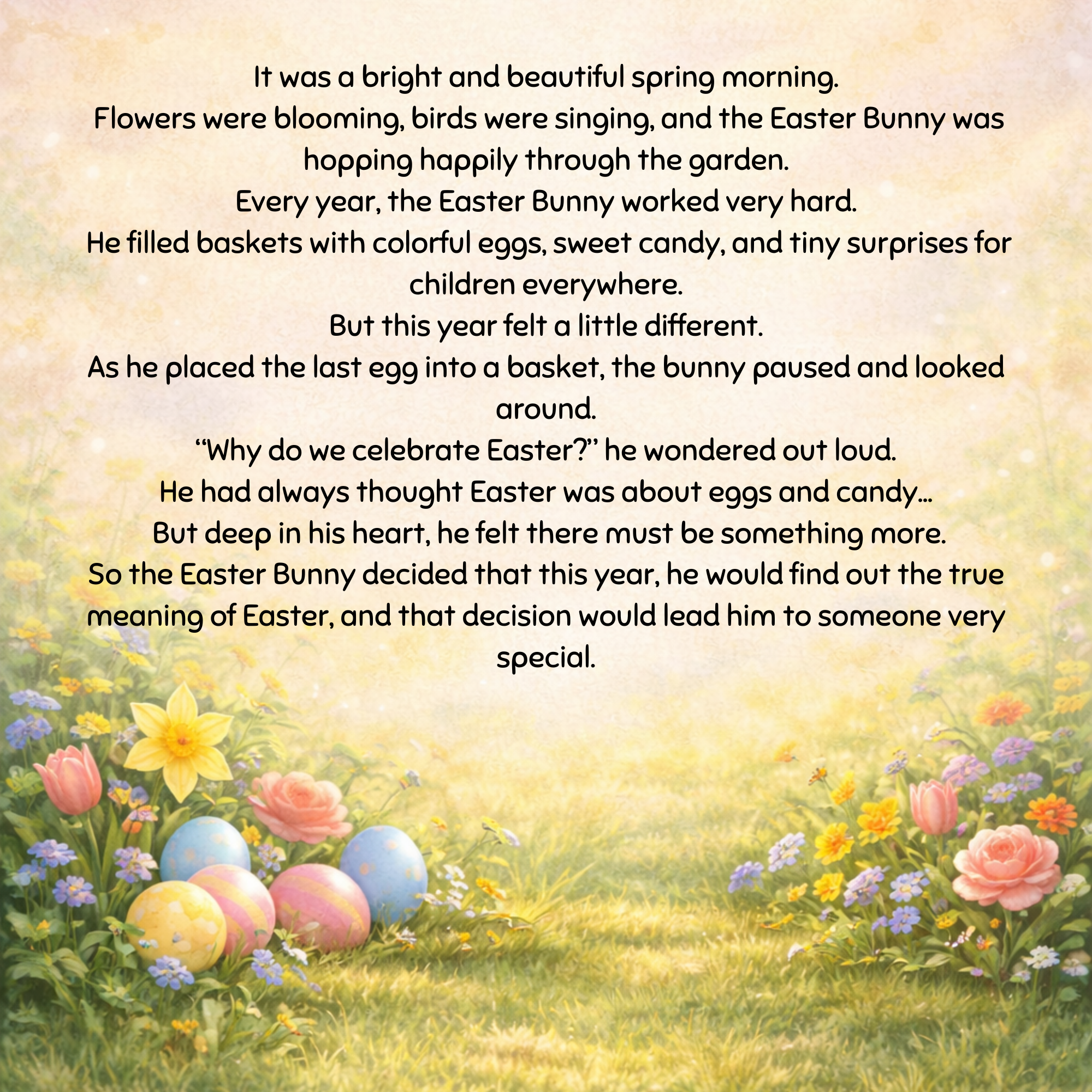 One beautiful spring morning, the Easter Bunny begins to wonder why people celebrate Easter. He has always delivered colorful eggs and sweet treats, but something inside him feels like there must be something more.